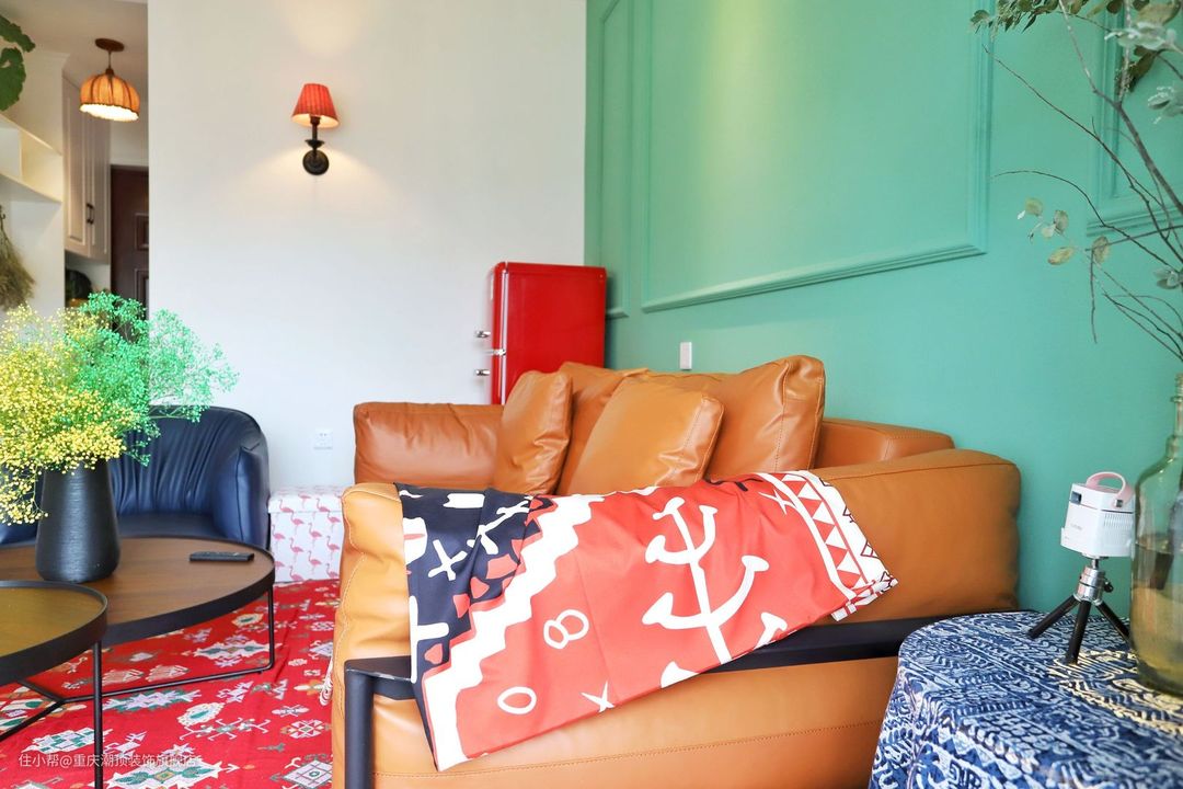 绿色的电视背景墙与米白色的沙发背景相映成趣,融入原木地板,三色融合设计,棕色实木家具等,碰撞视觉美学效果,营造出充满古典气息的候气氛,搭配复古风地毯融入现代元素,整体质感拉满