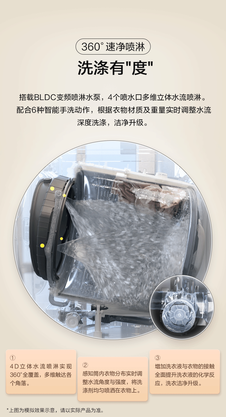 ▲再来一张360°喷淋的展示图,这张更为清晰,需要注意的是该功能只适用于5Kg以内的衣物清洗哈,差不多等于两套四件套这样的重量