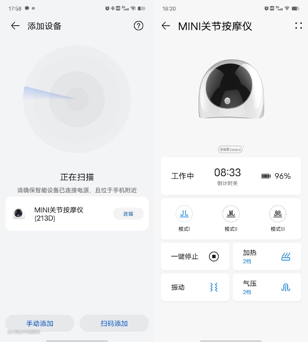 倍益康A1的按摩方式主要是气囊按摩(腿部、膝盖)+震动按摩(膝盖、腿部)+热敷(膝盖)。