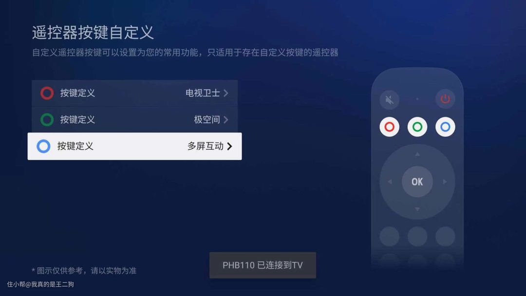 最后再特别说说遥控器新增加的自定义按键功能,二狗觉得这是个很棒的设计。传统电视在访问一些功能或者APP一般都需要经过较为复杂的访问路径,现在通过设定快捷键后可以一键直达。自定义按键支持设定最多三个功能或者APP选项,足够满足日常使用。
