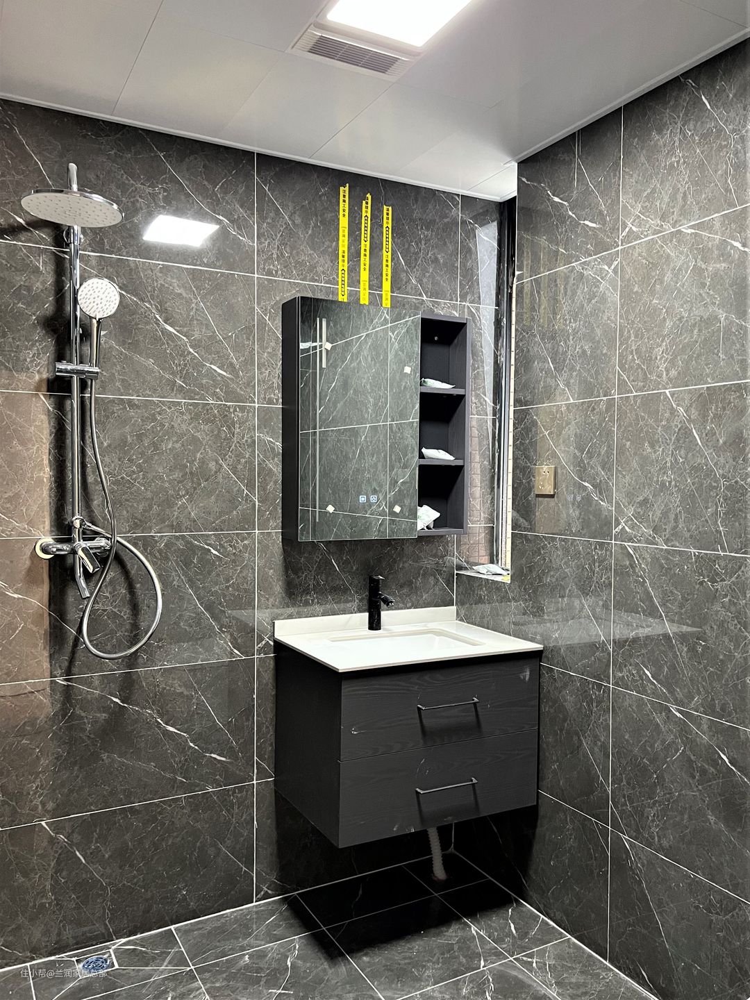 大理石纹瓷砖自带高级感,不规则的纹理感大气优雅,卫生间面积比较宽敞的情况下,用大理石纹瓷砖是不错的选择。