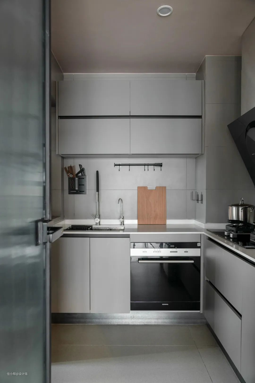 ▲在这个厨房设计中,我们选择了铁艺玻璃门,旨在增加厨房的采光。此外,我们还选择了灰色系列的橱柜门板和墙地砖,这样不仅能够与玻璃门形成互补,还能够营造出一种简约而不失高贵的氛围。