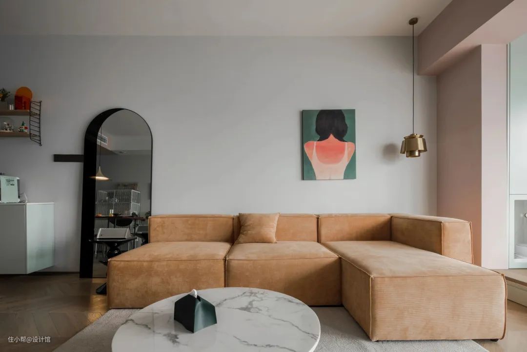 ▲沙发旁边放置了一面拱形阴影镜,这是女主每天自拍的地方。这面镜子既美观又实用,为女主提供了一个方便的拍照角度,也为整个客厅增添了一份时尚和个性。
