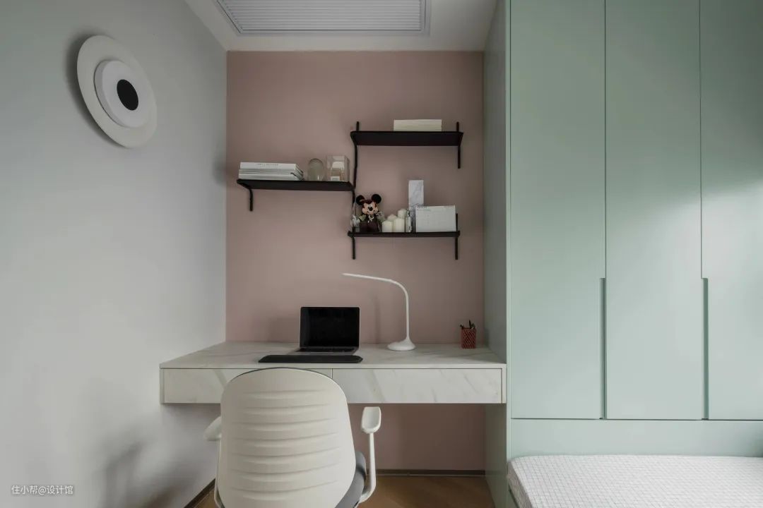 ▲设计师还增加了书桌的位置,并采用开架形式,不仅方便孩子们存放书籍和文具,而且整个房间的视觉效果也更加开阔,不会给人一种拥挤的感觉。