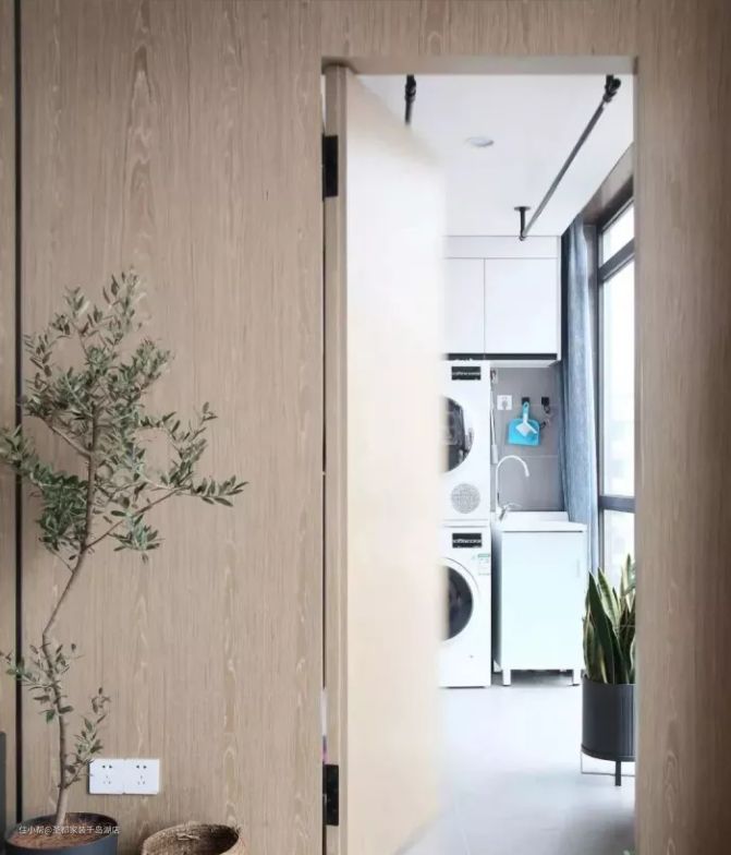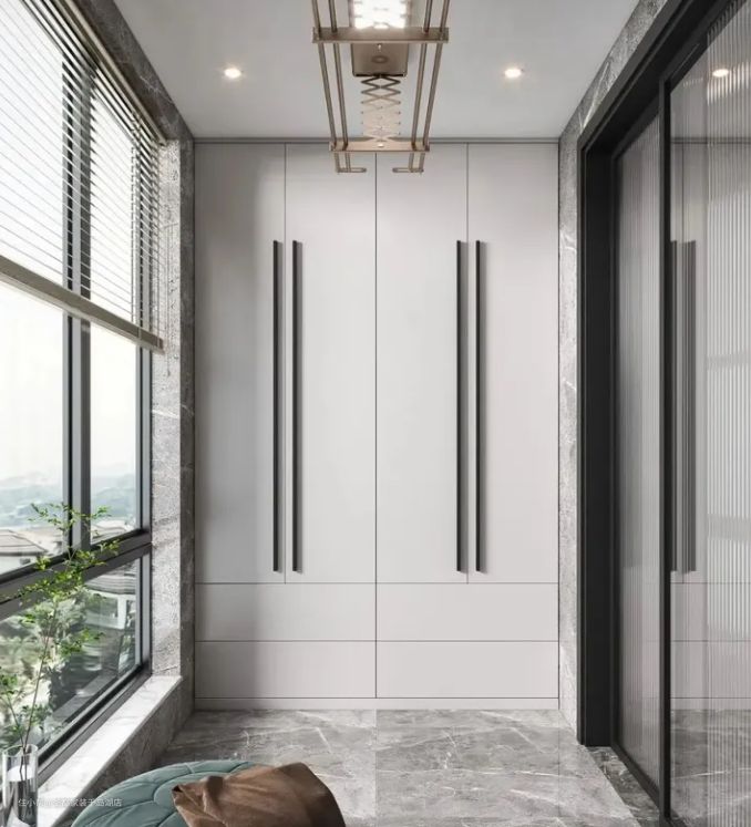 有人说,我家阳台本来就是封好的,总不能再砸了吧?其实可以利用铝合金柜体隔断将阳台一分为二,一侧是洗衣柜一侧是衣柜,同时柜体底部抬高,防水效果更好。