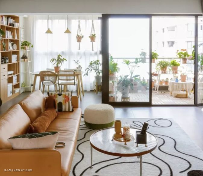 开放区域洗衣、晾晒、养花,封闭区域搭配桌椅茶几、沙发卡座、收纳柜,做阅读区、休闲区、储物区。