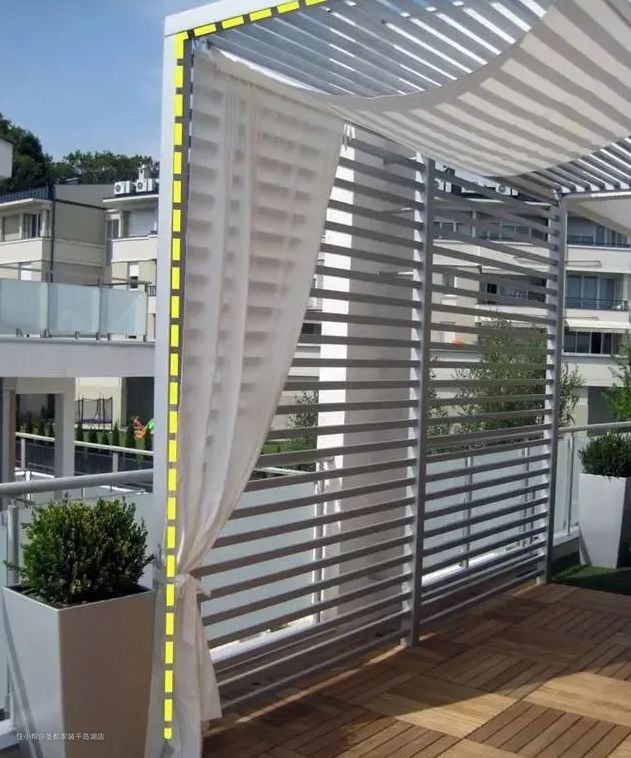还有一种是“7字型格栅板”,遮阳通风效果好,搭配窗帘私密性更强,关键是成本低,不想要了拆了也不心疼。想要挡风挡雨的,可以考虑玻璃板+与格栅板的组合并且不打通阳台与室内。