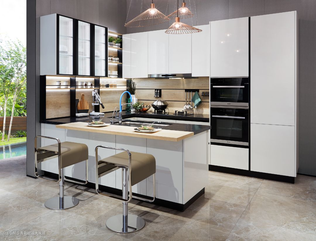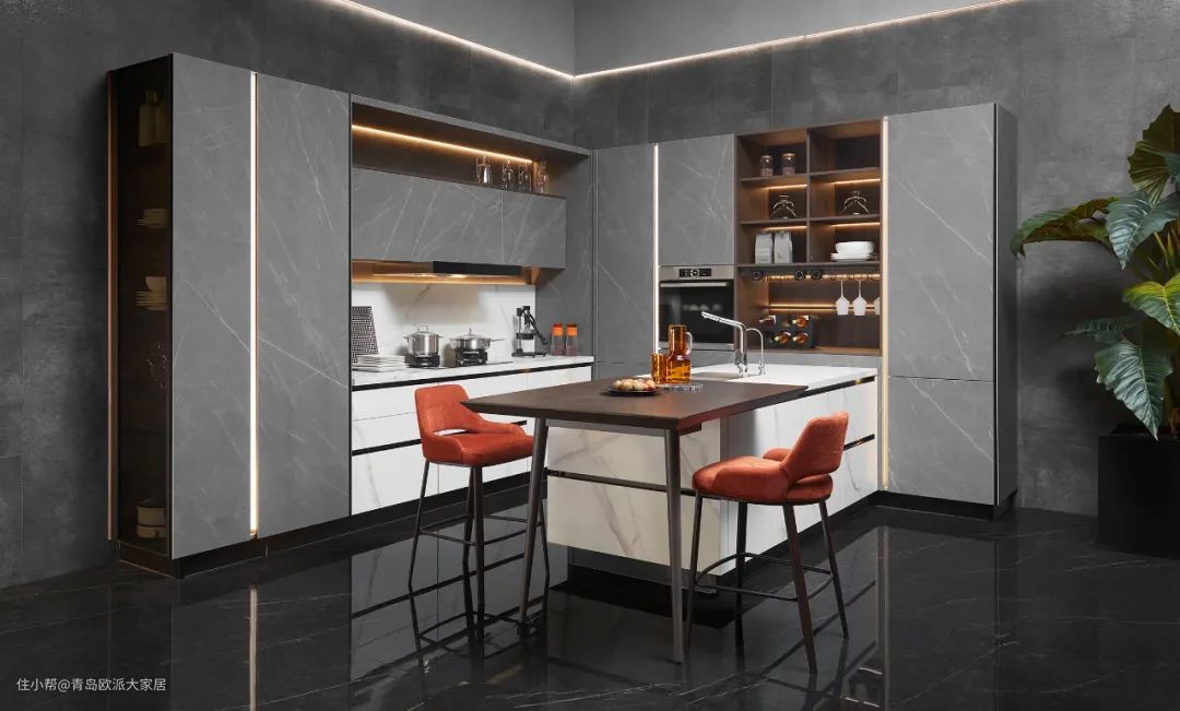 U型布局设计为多人同时备餐提供了更充裕的空间,转角处延伸岩板吧台,更方便就餐,同时极简造型中透露着精致质感,彰显不俗品味。
