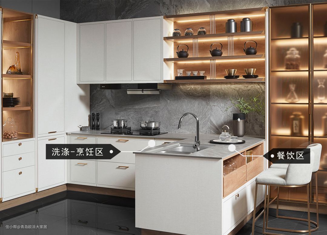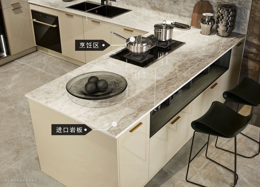 这款U型厨房将烹饪区设计在转角吧台上,为热爱美食的你提供更宽敞的操作空间,实用性满分!搭配纹理丰富、光滑亮丽的大理石进口岩板,打造时尚优雅的格调私厨。