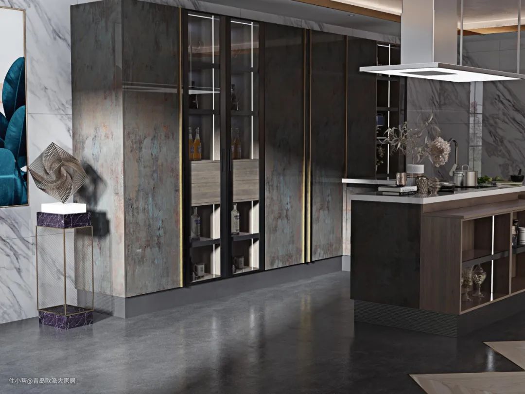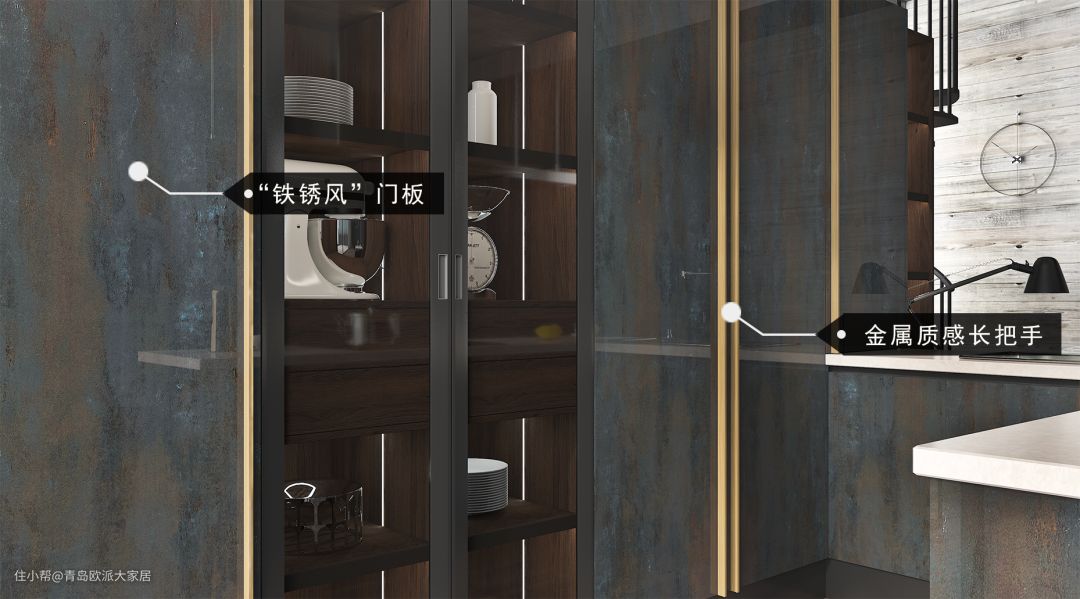 除了木质元素,金属材质元素也常常用于橱柜造型中。这款橱柜就采用了丰富的金属元素,个性大胆的“铁锈风”门板设计,自带尊贵冷冽感;