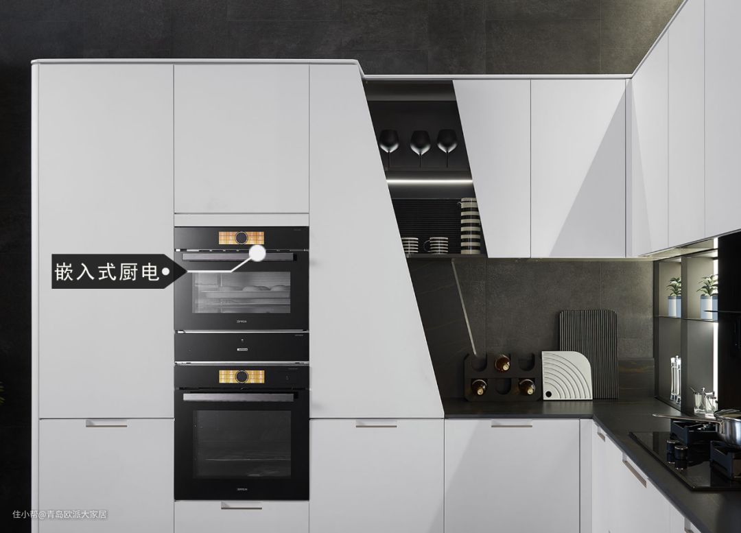 将嵌入式电器半隐藏在橱柜中,可让U型厨房的整体更加美观、视觉上更统一协调,减少外观突兀感。嵌入式一体化设计大大提升厨房空间利用率,小户型也能打造大厨房。