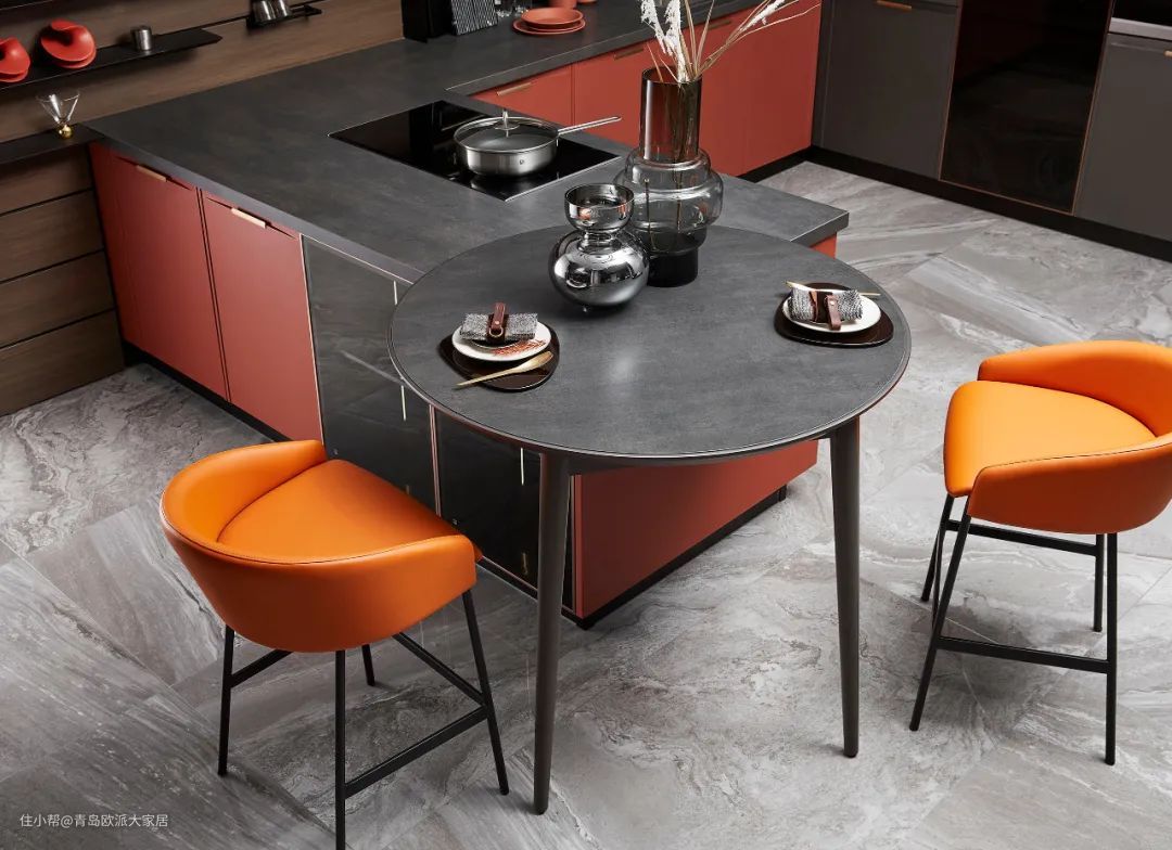 沉稳的泰坦灰撞上了靓丽的黛思红,为灰色系空间增加一抹亮色,显得内涵稳重而不古板。门板造型简约利落,生动诠释当代厨房极简美学。