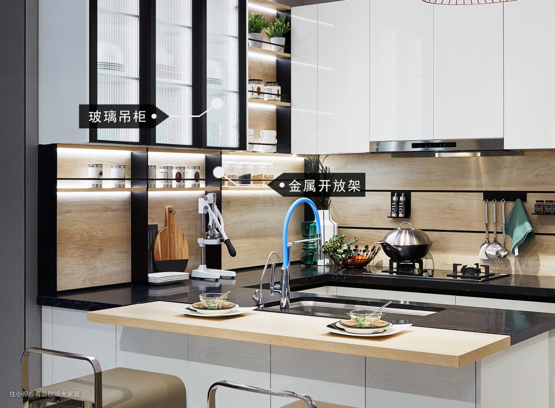 玻璃吊柜可用于存放红酒及玻璃器皿,在灯光映照下,彰显精致优雅生活。金属开放架适合调味品和精美厨房用品收纳,拿取十分方便,下厨效率更高。