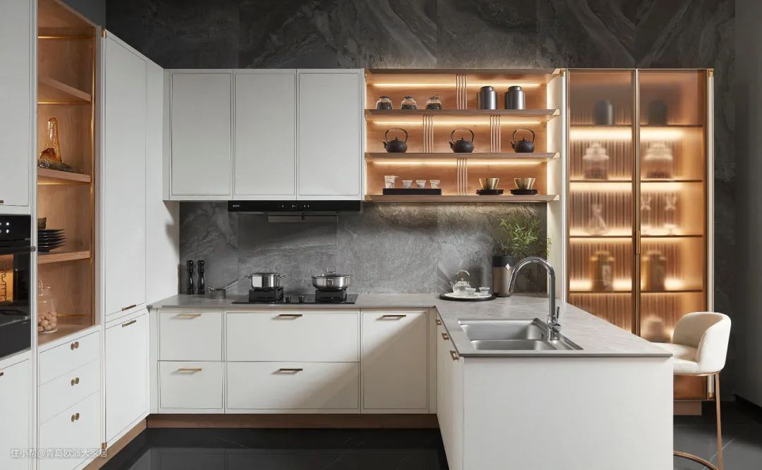 喜欢U型厨房布局,又想感受轻奢的优雅情调,时尚质感的香槟色金属铝框与厨房灯光相呼应,优雅精致。