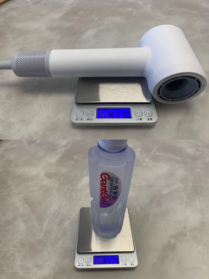 重量这块我拿了一瓶矿泉水和徕芬吹风机进行对比。