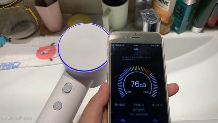 官方说的噪音最低是59db,因为我室内音就有80分贝左右,测出来的平均值在76分贝,最小值是50分贝,也是在合理值范围 真的可以说算是静音吹风,再也不用担心晚上吹头发的时候还打扰另一半休息了