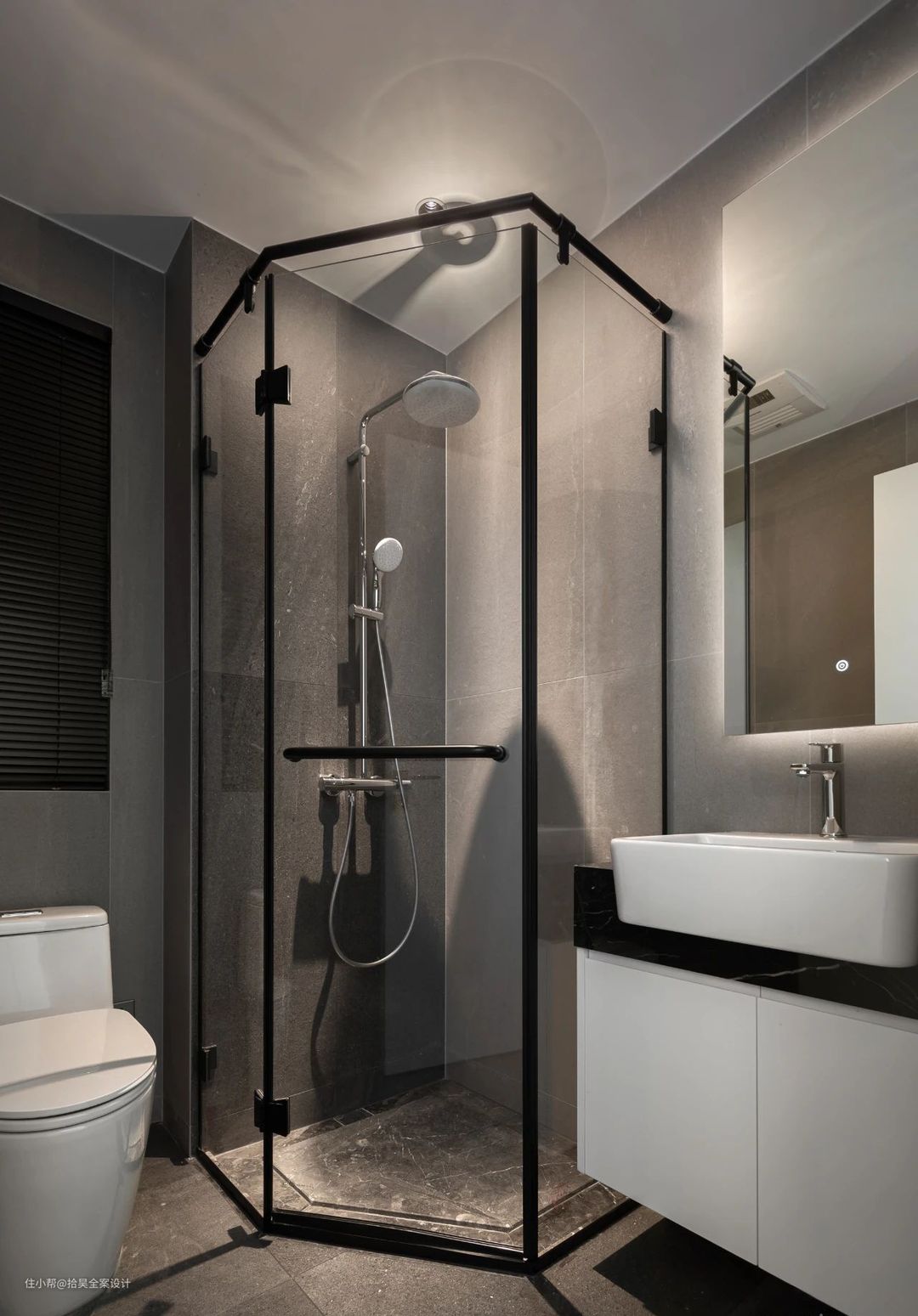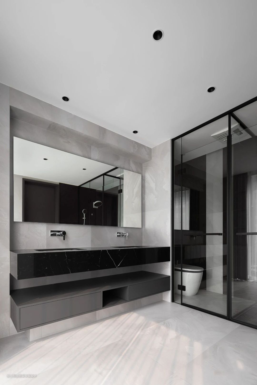 主卫空间较大,淋浴区和马桶通过玻璃隔断分别处于不同的空间之中,外侧还拥有双台盆的洗漱空间,实现了真正意义上的干湿三分离功能,所有的细节无不展现屋主的舒适和生活品质。