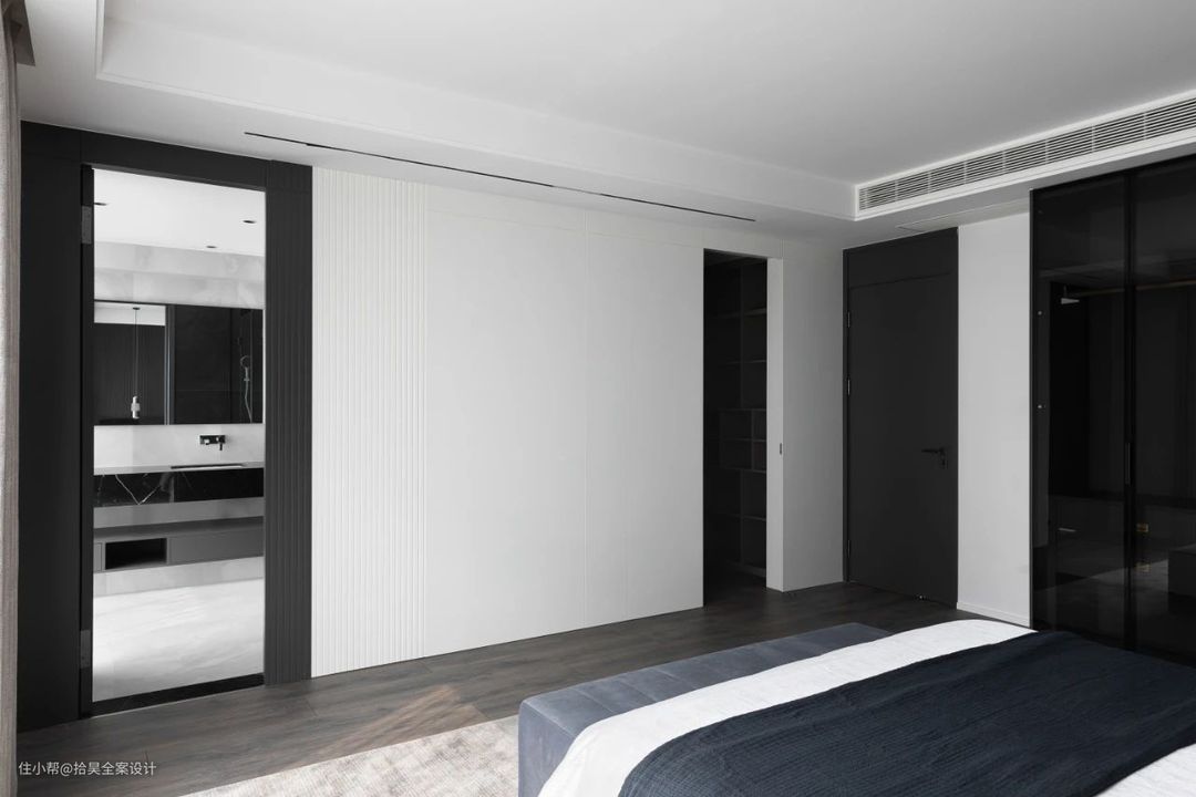 在这个拥有精致清逸的主卧套房中,床尾背景墙背后的巧妙设计值得称赞。卫生间和衣帽间均分空间,细节之处尽显匠心独运,为了不让床尾空间过于单调,在主卫门的两侧墙面做了黑白色拼色的格栅装饰。