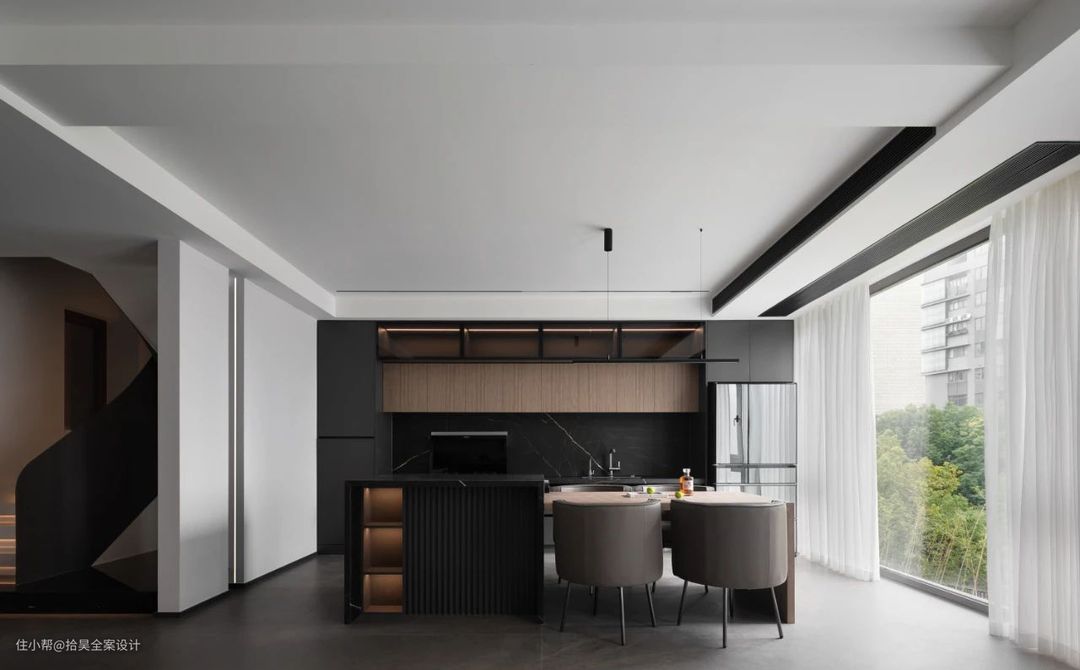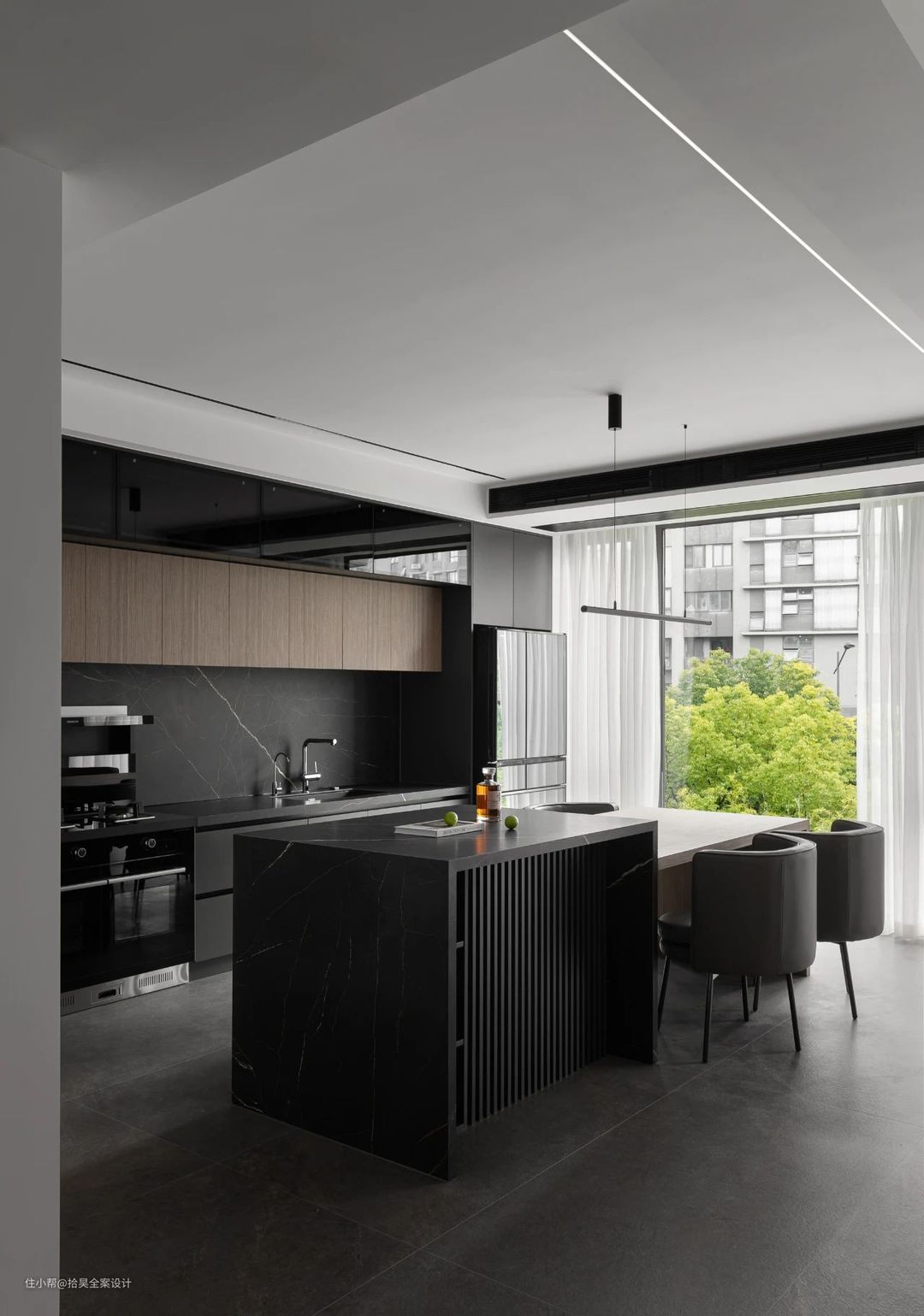 客厅的另一侧,是定制设计的全开放式餐厨空间,在这个不食烟火的西厨餐厅里,一切都尽显质感黑色调的深邃魅力。岛台餐桌上方,线性灯具宛若繁星般闪耀着,恰如其分地映衬出了一字型的西厨。落地窗带来的光透过窗纱柔和地洒下,仿佛在良久的沉思后再次被激活的静谧,叫人无法拒绝。在这里,享受美食,品味人生。
