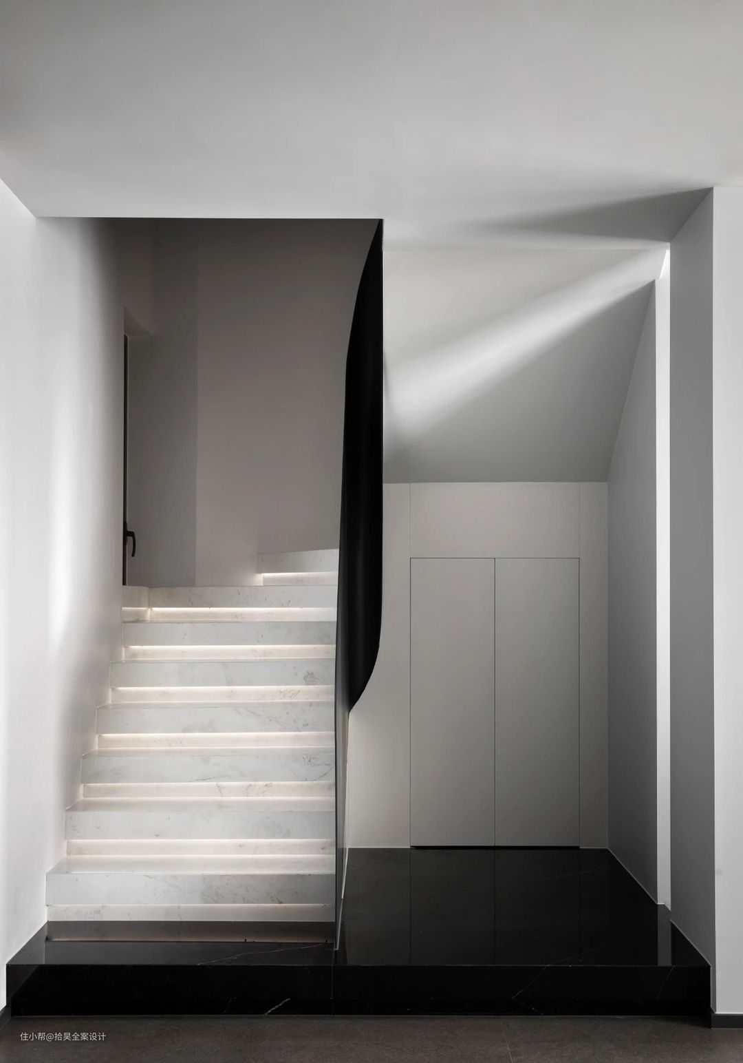 玄关左侧转进来,正对的便是通往二楼的楼梯,色彩上仍旧是黑白色调的搭配,整个楼梯设计置于抬高的黑色大理石地台之上,楼梯下方空间内嵌了一组收纳柜体,日常生活中必要但不常用的工具都隐藏在白色的柜门之后,干净整洁。