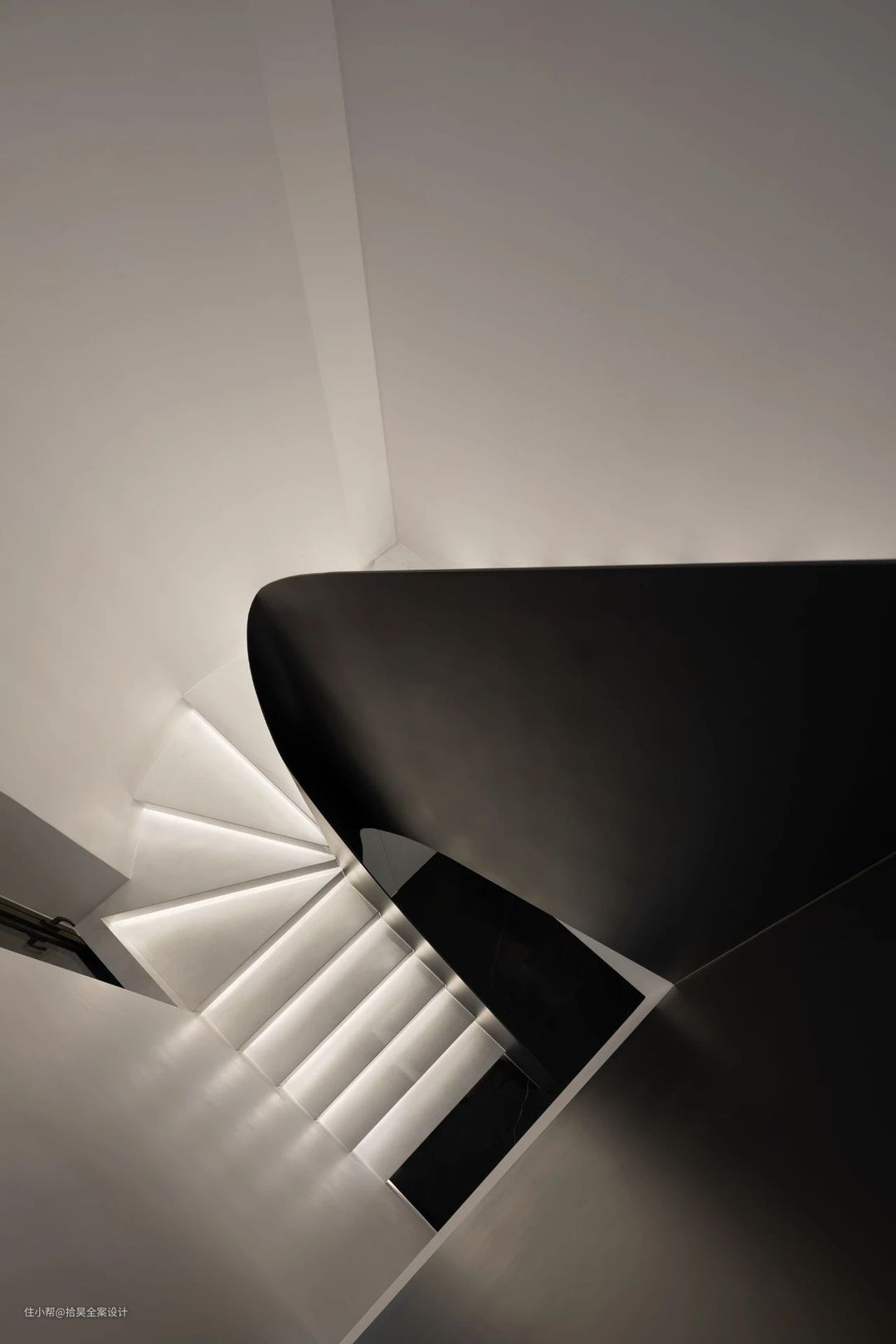 黑色的薄扶手过渡空间,让居者安心地攀升至高处。而那如明灯般的十九步梯灯,为人指引方向,照亮前方的路。一步踏实,一步持稳。黑白永不过时,却又永恒美好。