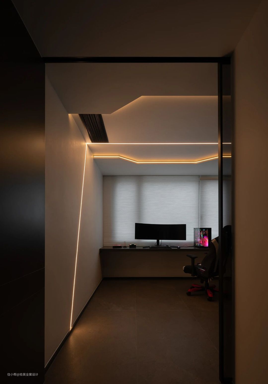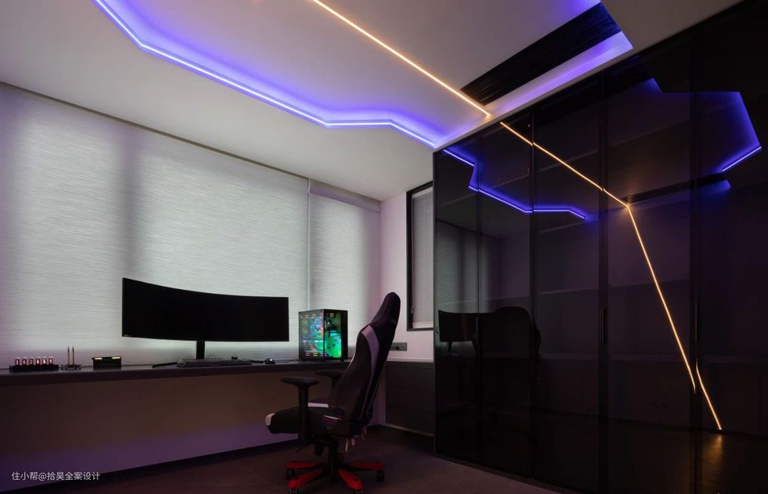另外,在这个电竞房里,渐变氛围灯营造独特的炫酷感,让居者仿佛置身于科幻世界之中。精美的多边造型吊顶,在变幻的灯光中也透出熠熠光芒,宛如夜空中的星星点点,照亮整个空间。