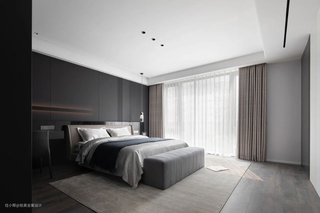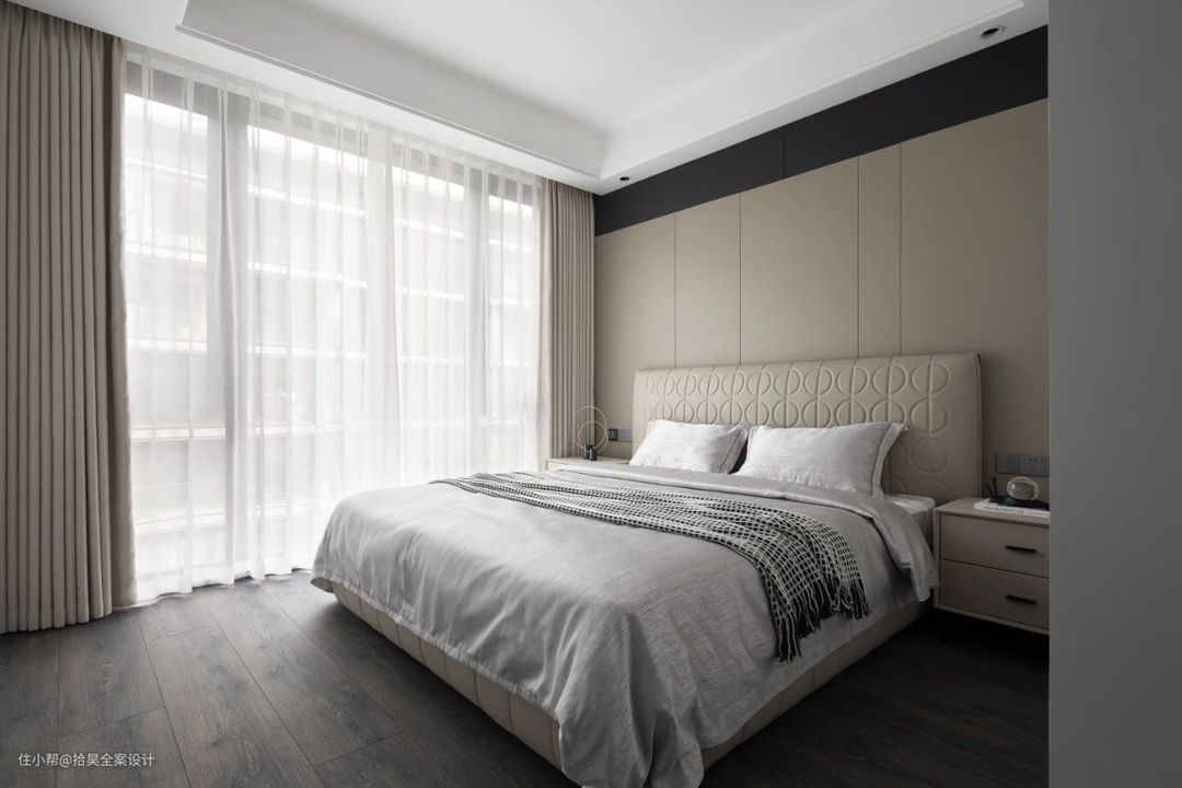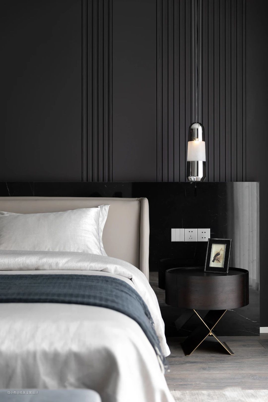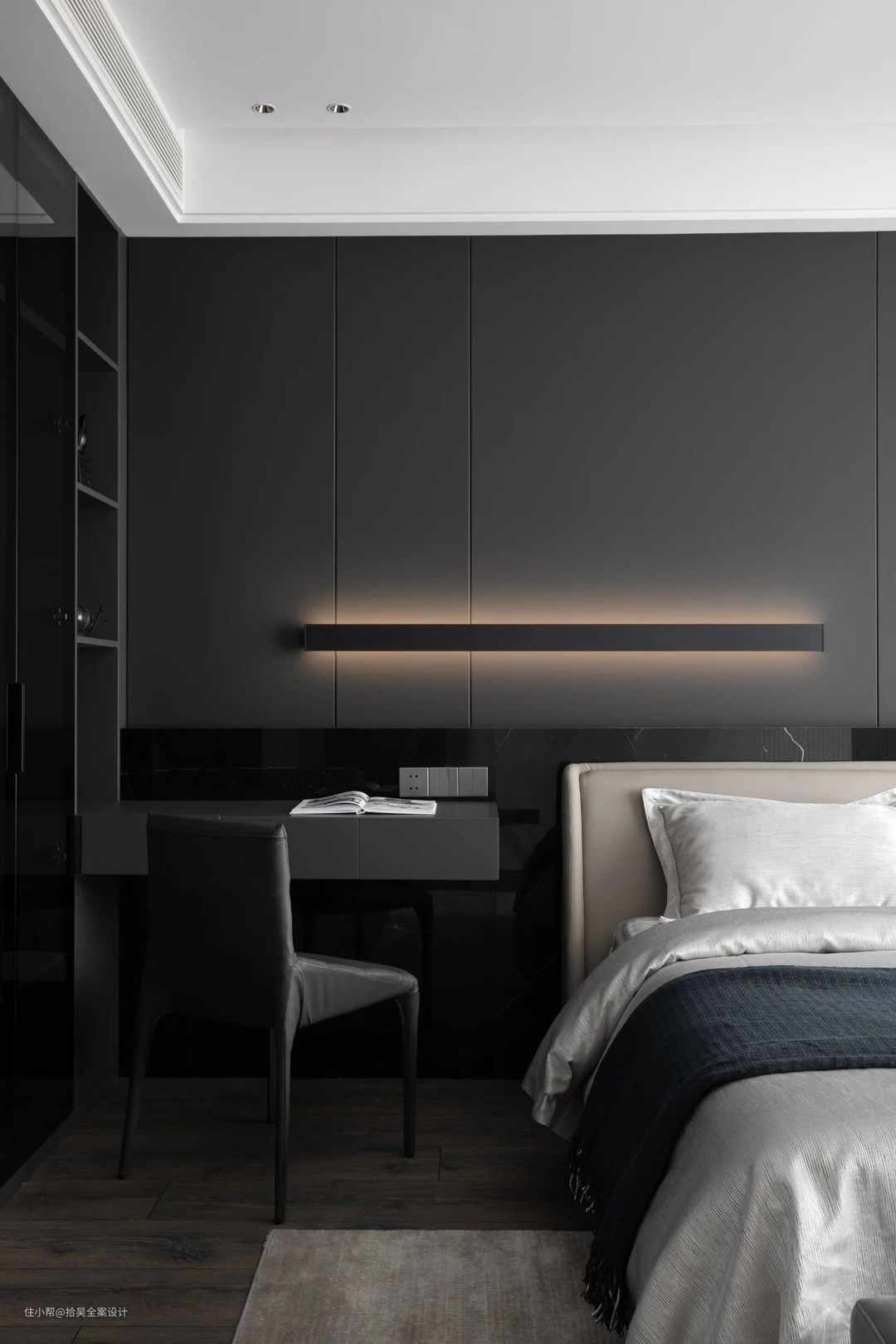 质感黑调的床头硬包,与格栅拼接搭配,为空间增色,恬淡清雅。简约线条与现代风格融合,自然流畅的形状勾勒出简约且高雅的空间。深夜遁入梦乡,来一场清幽唯美的梦境。