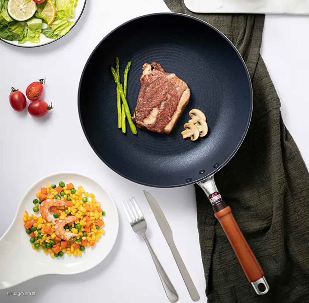 优点是:不容易粘锅、宣传可以使用钢铲。