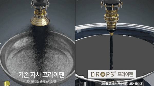 比如上面的动图前半段可以看到,左边传统品牌的PTFE涂层是喷涂的,因为喷涂工艺有较多缝隙,代表油与食物的金色会渗进锅面。
