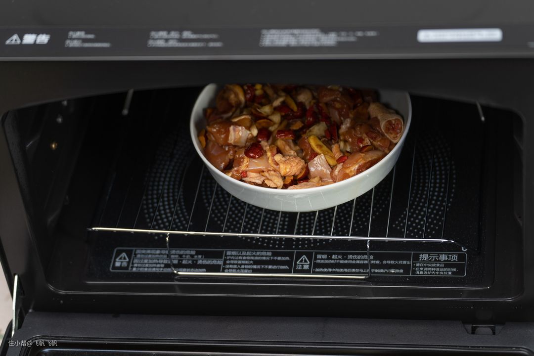 同样参考食谱把烤盘放入上层,打开菜单选择22号深盘焖煮功能,按下开始然后就可以去打打游戏听听歌啦。