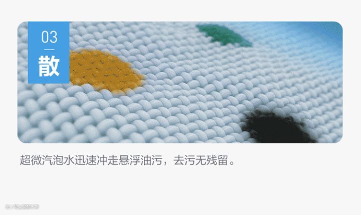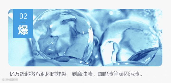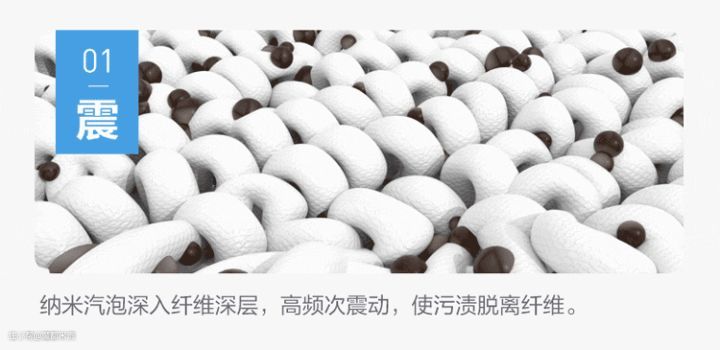纳米气泡深入衣物纤维,高频次震离污渍;亿万纳米气泡炸裂,剥离顽固污渍;超微气泡迅速冲走油污,减少残留