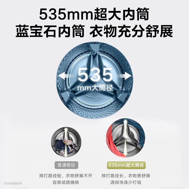 蓝宝石超薄内筒,深度更薄,直径更大,大件衣物洗烘更舒展
