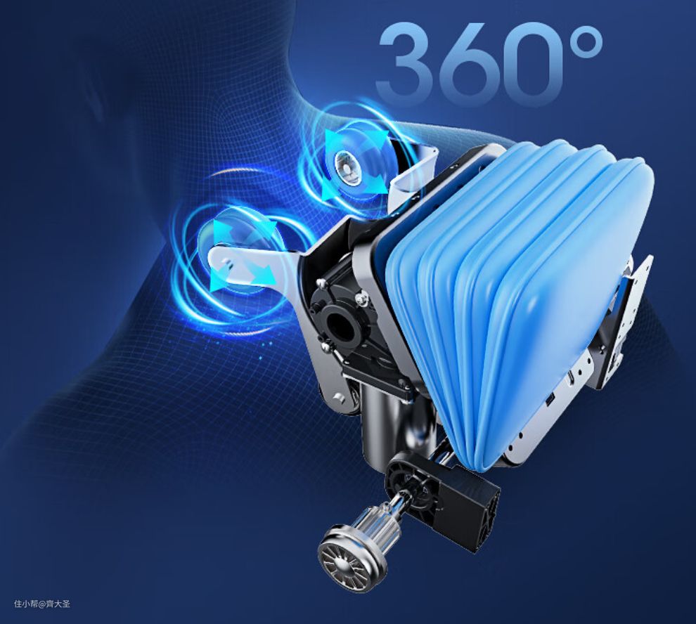 奥佳华7608TEN+采用的360°筋膜大师机芯,可以称之为准4D机芯,在旧款3D机芯的基础上增加了气囊弹性缓冲,不仅可以实现机械手前后、左右、上下按摩,还能再机芯行进过程中,通过气囊推动机械手前后伸缩,实现双重摩力感受。