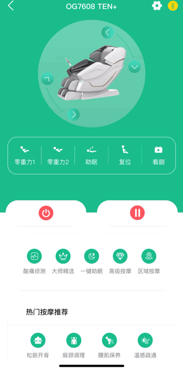 我个人比较喜欢的功能,下载app通过蓝牙连接按摩椅后,即可通过手机来遥控,相比自带的液晶触控遥控器,手机无论是显示效果还是直观性都要更好一些。不过如果家里有老人、小孩的话,遥控器还是必不可少的了。