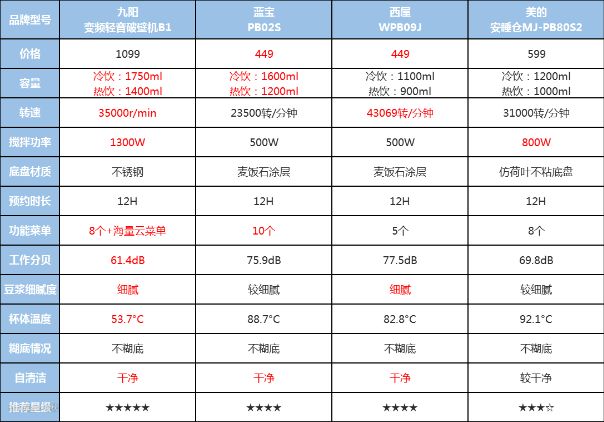 四款轻音破壁机的基础数据和测试表现,我都给大家总结好了。同时标红了每一项对比突出的两款数据,方便大家查看。