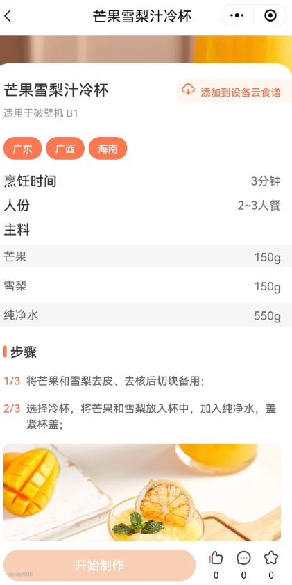 此外,它的云菜谱也是一个很出彩的功能,通过小程序链接机器后,就能用破壁机制作上百款美食,跟着食谱准备材料,并且还能一键启动机器调节时间、力度、刀头转向,非常省心方便。