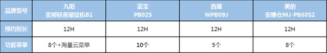 其次就是他们的面板菜单,九阳、美的均为8个功能程序,蓝宝、西屋均为10个功能程序,对于日常使用来说,基本都是能满足的。
