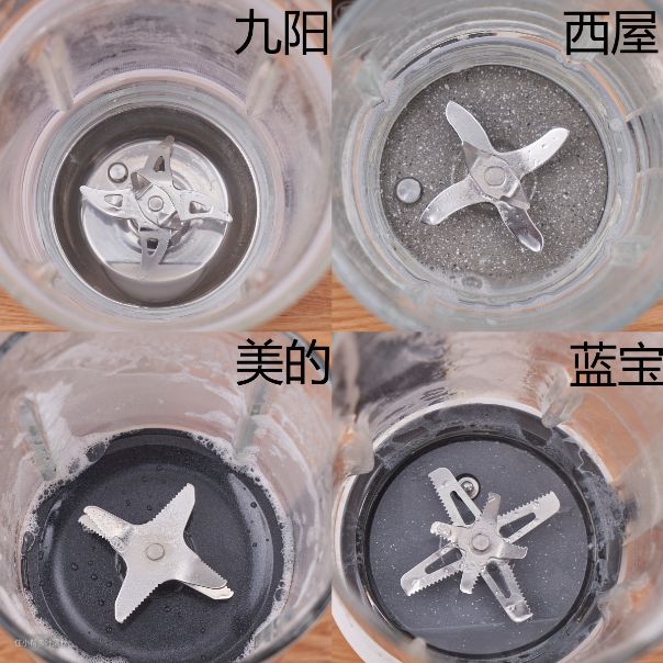 从下图我们可以看出,四款破壁机都是没有糊底的。其中蓝宝、西屋、美的的底部都有防粘涂层,具有一定的防糊底作用。而九阳底盘是不锈钢材质,可能由于底盘加热的原因,在制作豆浆后也没有出现糊底的现象。