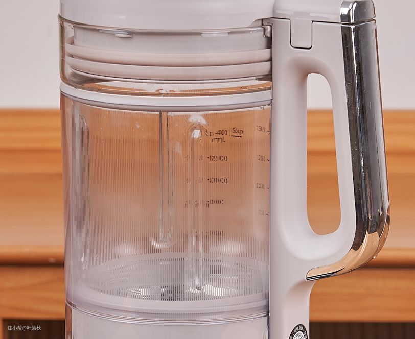 它的杯体也是大有玄机,这个一体式双层隔音杯的杯体,不仅能隔音还能防烫,在杯内加热温度已经到了八九十摄氏度,外部杯体实测只有五十多摄氏度,使用的时候不会担心烫伤;它还是电机和杯体分离式的设计,自重相对比较轻,拿取很方便,在清洗时也不用担心进水漏电,安全性更高。