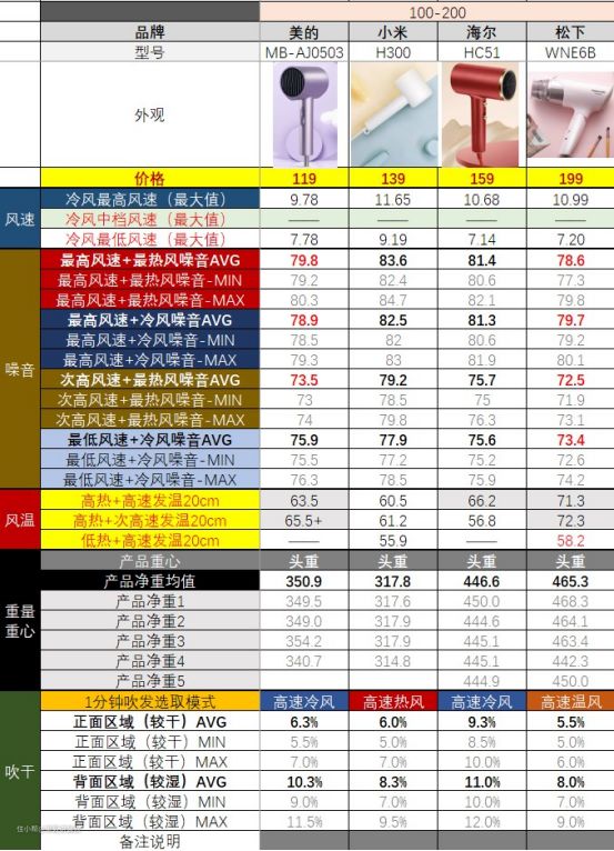 不过也有例外,松下WNE6B和美的503热风下才有最小噪音