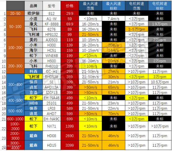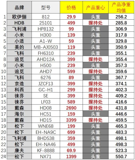 首先,尽管已经选了各价位的24款吹风机,但相比吹风机款式总数来说,样本还是有点少