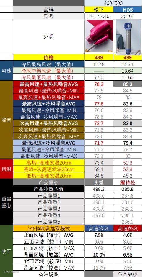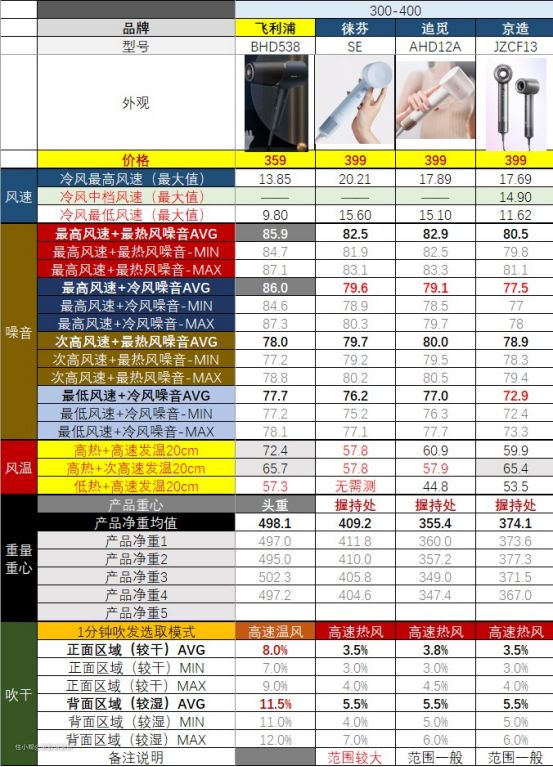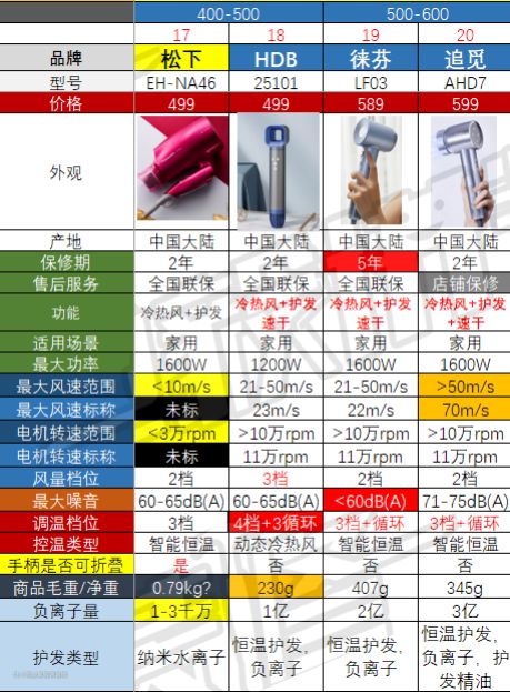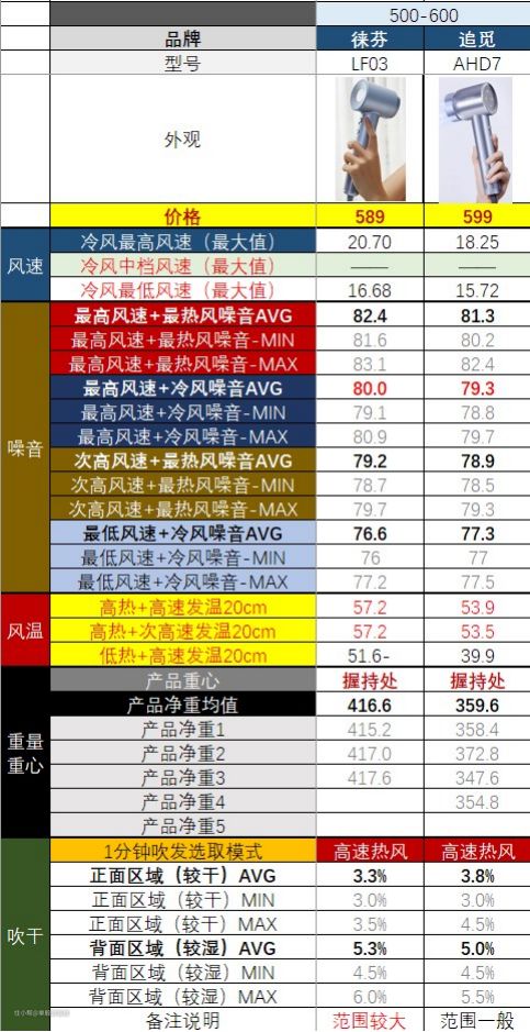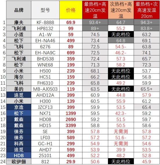 高速吹风机和准高速吹风机,也就是表格里标蓝底的那几款,风温控制的都比较好,确实不是靠高温来干燥头发。