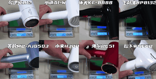 而高速吹风机和便宜的吹风机则会轻一些,这里面的异类是康夫的KF8888,严重怀疑它故意为了增加重量在机器里塞了铁块