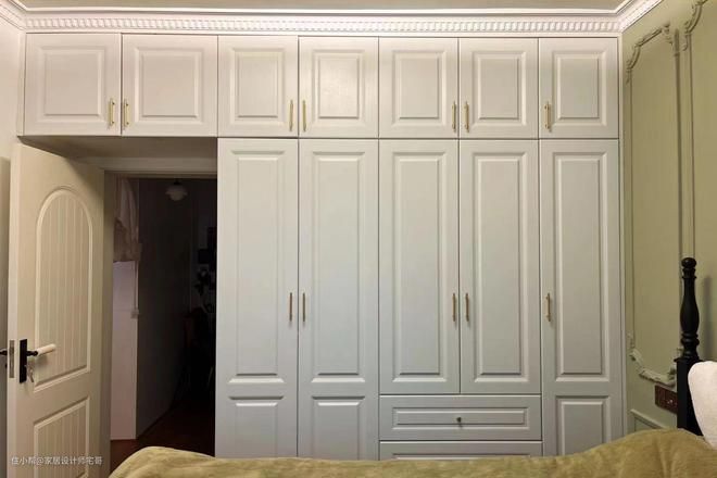 卧室门一侧做了满墙的通顶衣柜,连门上的空间也没有浪费,收纳能力非常强。