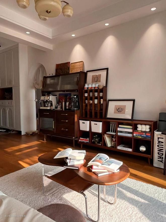 客厅电视背景墙一侧摆放了一组胡桃木材质的复古餐边柜,摆上咖啡机,就是一个小小的咖啡角。