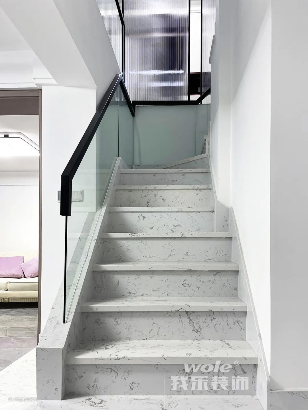 楼梯是跃层户型特有的景观。铺上带有纹理的高级灰大理石,在灯光的照耀下瞬间提升了空间的高级感。楼梯的扶手原本是猪肝红色,为了契合黑白灰的整体简约风格,改成了黑色。