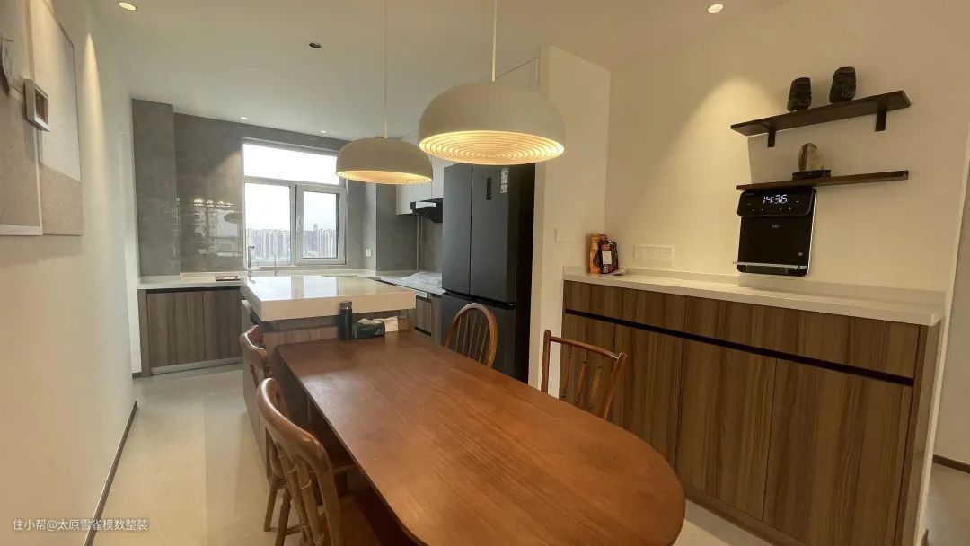 同时,这样的设计也达到了美观与实用的完美结合,岛台与餐桌连在一起满足了家长一边做饭一边辅导孩子做作业的需求,实现了空间的多场景运用。