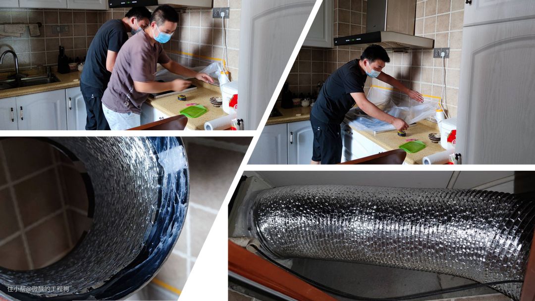 安装过程中师傅也是非常负责,先用塑料布做了保护,避免灰尘弄脏厨房,然后接缝的地方能打玻璃胶的地方都打了,避免从缝隙中漏烟出来,安装完成后还有非常重要的一步,师傅调出油烟机自检模式,根据风机转速判断烟道阻力情况,烟道没有堵塞后,才算安装完成。