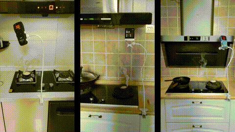 测试方法就是我多年前设计的实验方案,将PM2.5测试仪架在日常烹饪时口鼻所处的区域,然后点燃一颗7cm直径的舞台烟饼,产生巨量浓烟,让油烟机排走这些烟雾,观察检测仪上PM2.5上的数值变化,变化越小,说明油烟机效果越好。