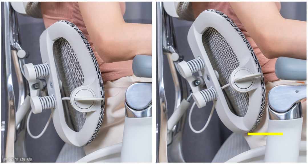 腰靠最前与最后的对比图。右边我画的黄线是腰托给身体支撑点的最尾端,这里恰好是L5与骨盆衔接的位置,对有L4、L5腰间盘突出与下背劳损的用户这位置非常合理,大大低于传统双背人体工学椅下背对腰部支撑点,舒适感更强。